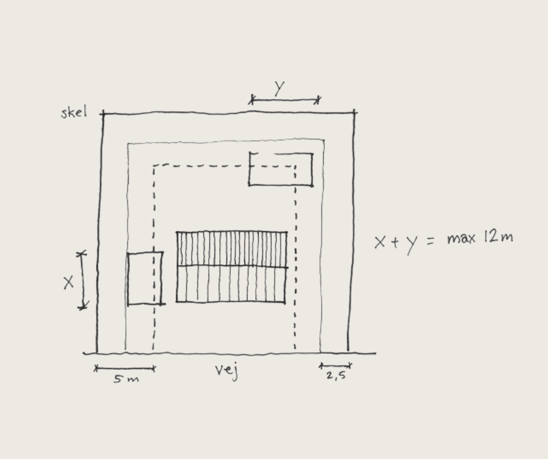 Det er muligt at placere flere bygninger 2,5 meter fra skel. Det er da den samlede længde af disse bygninger, der ikke må overstige 12 meter (se illustration 3).