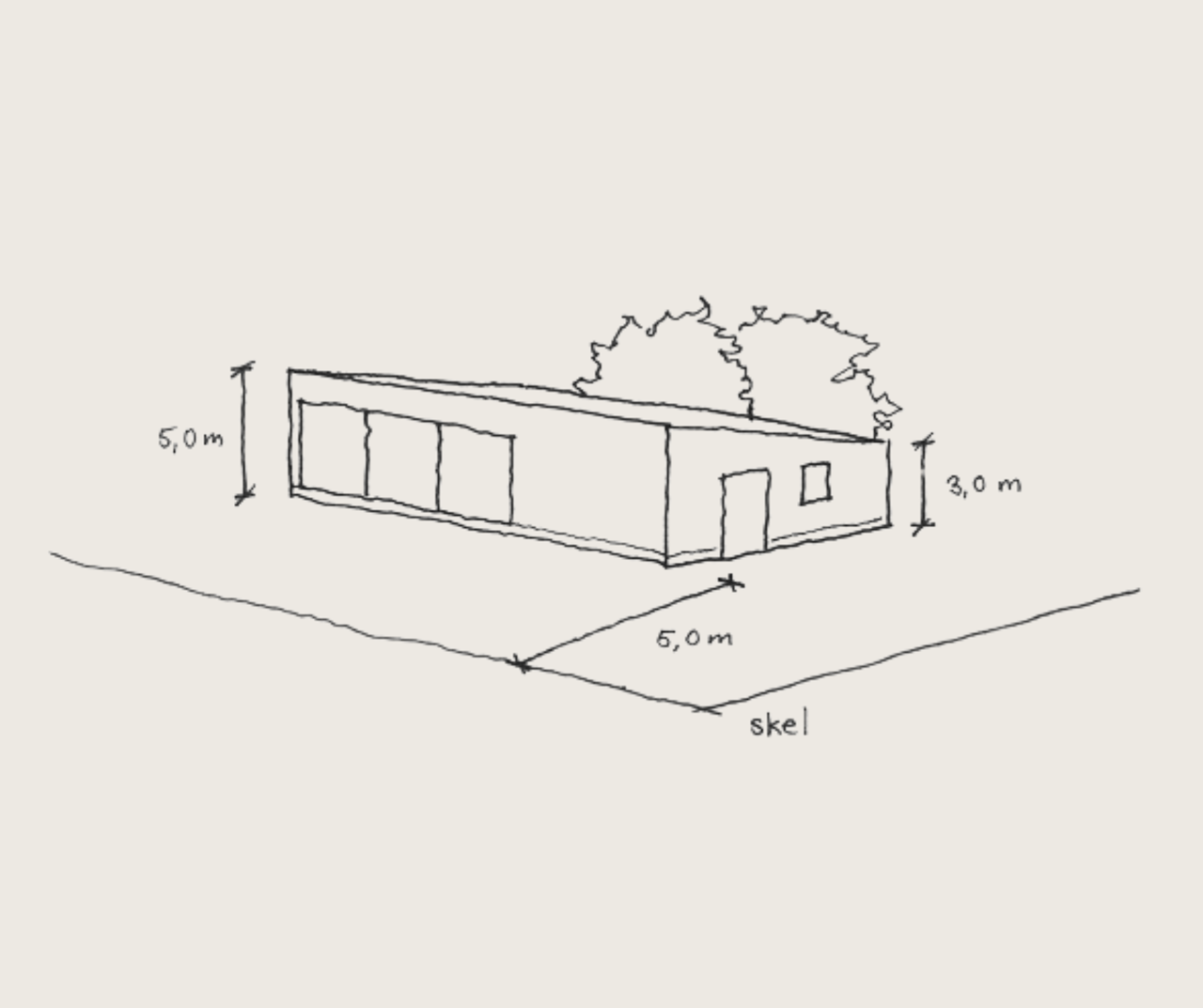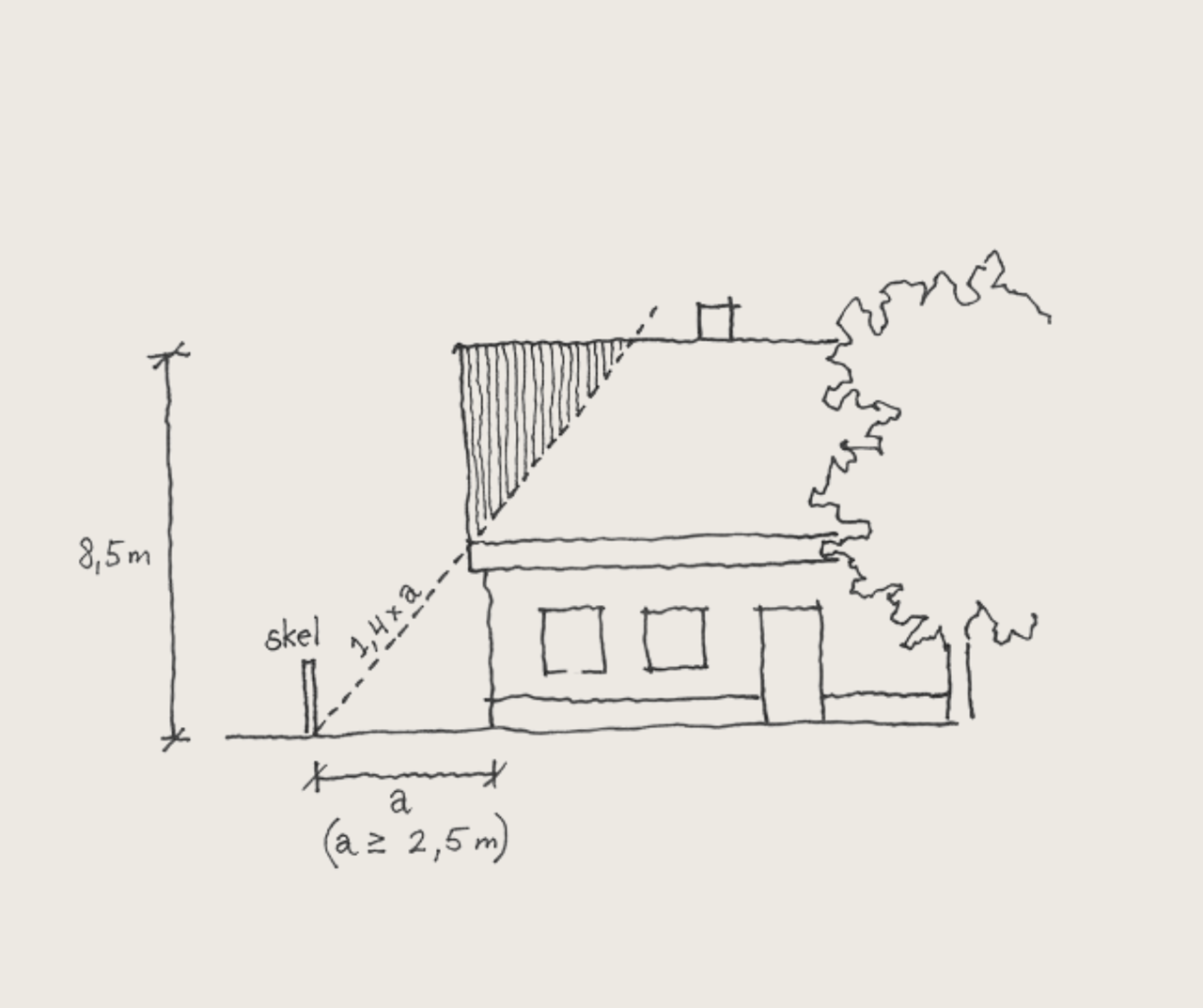 En bygning, der placeres 2,5 meter fra skel, må altså have en højde på 1,4 x 2,5 = 3,5 meter.