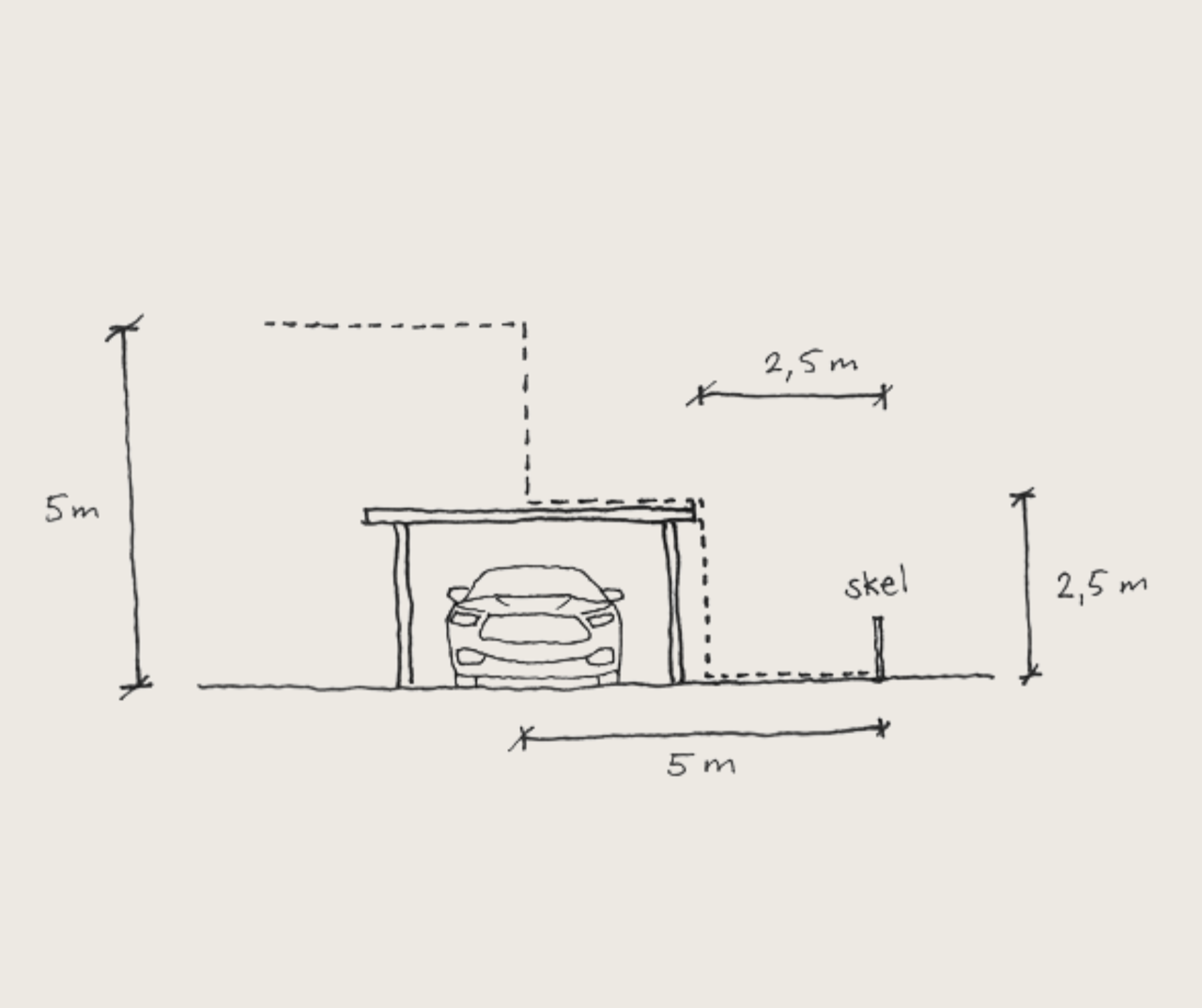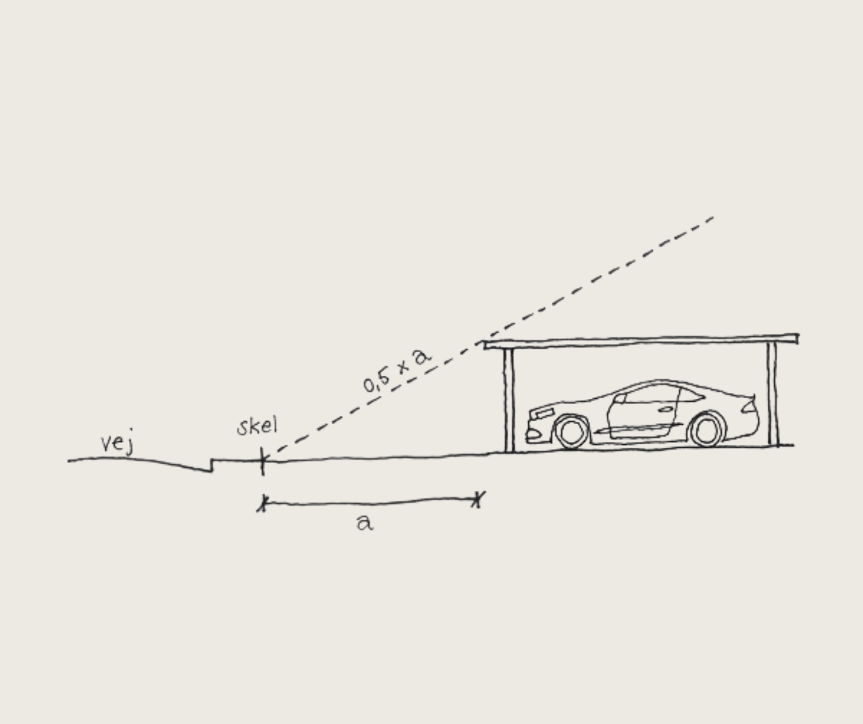 Højde- og afstandsforhold skal overholde reglerne i BR18, §182 og 183, for sekundære bygninger (garage, carporte og lignende).