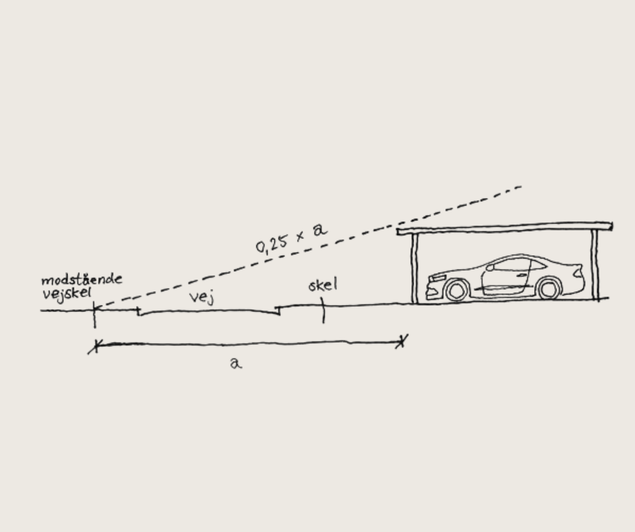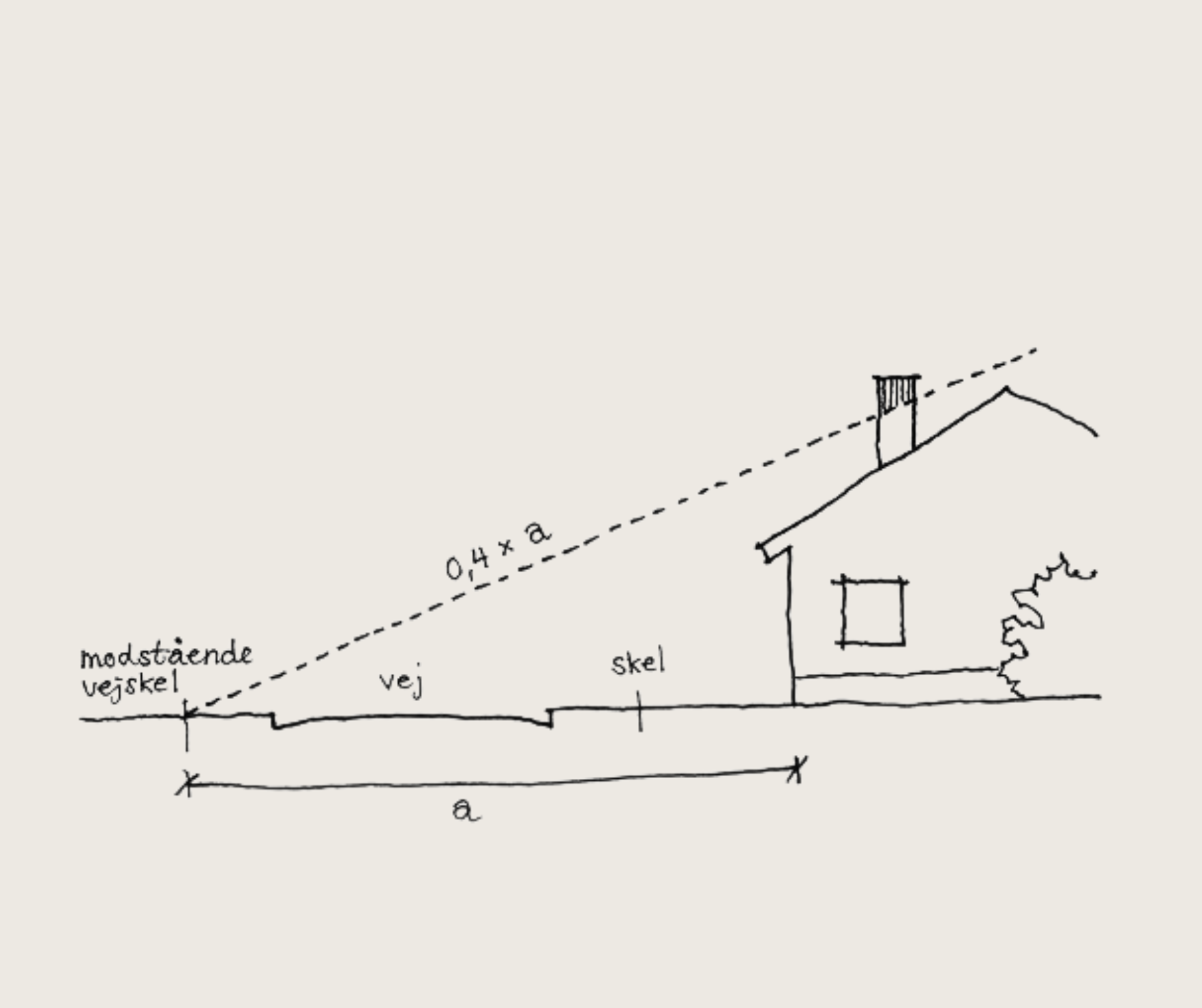 Mod vej må højden ikke være over 0,4 x afstanden til modstående vejlinje (vejskel) eller udlagt linje mod vej (se illustration 2). Dette regulerer dermed, hvor tæt på vejen du må bygge.
