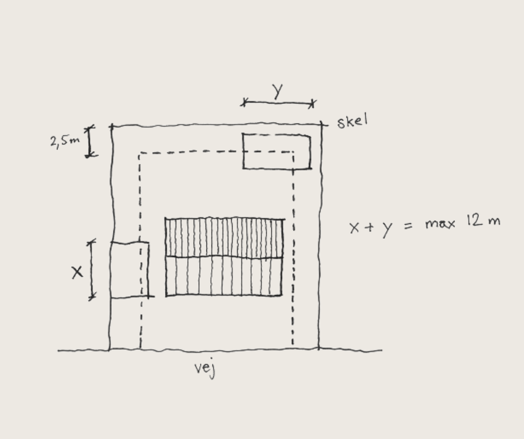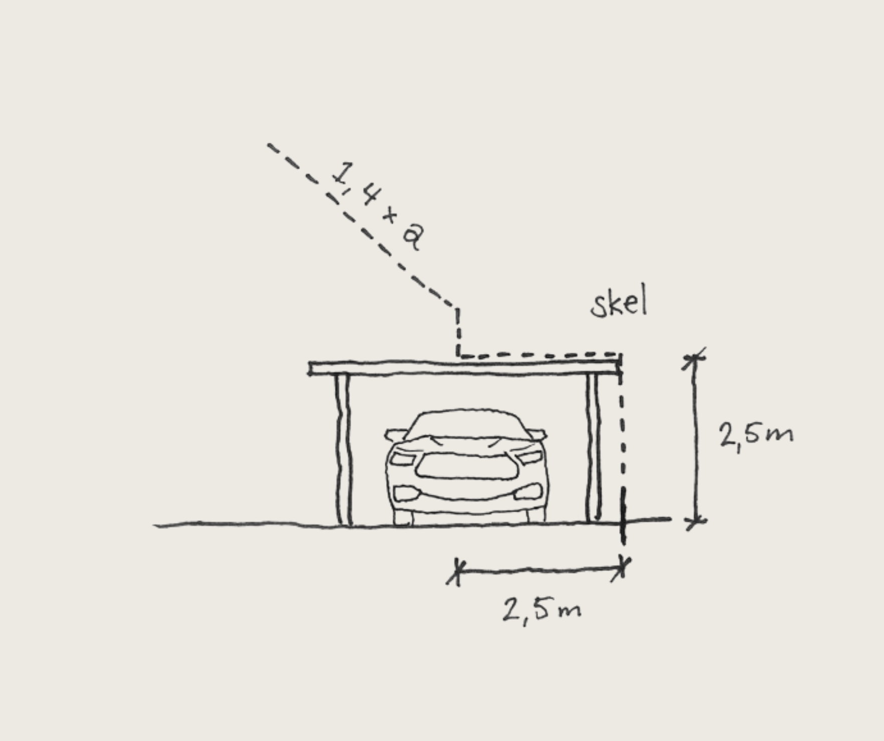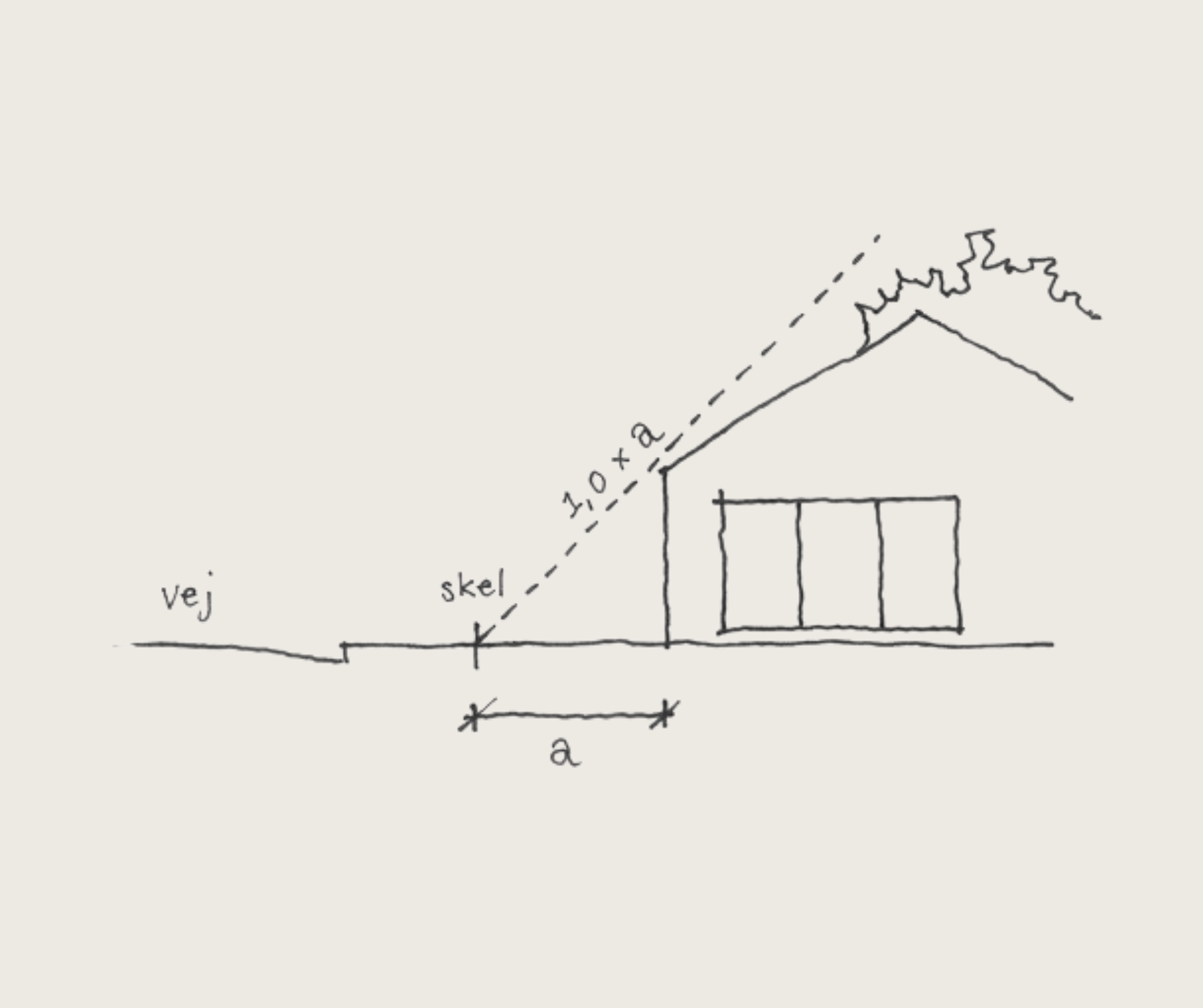 En bygning, der placeres 2,5 meter fra skel, må altså have en højde på 1,4 x 2,5 = 3,5 meter.